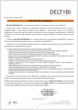 Lo standard ISO è il più diffuso e utilizzato per i sistemi di qualità a livello internazionale: Deltabi Costruzioni Srl punta costantemente al miglioramento e all’ottimizzazione e, attraverso processi interni ben definiti, è in grado di assicurare al cliente un servizio ed un prodotto corrispondente a determinate specifiche, e che tutte le fasi relative alla loro realizzazione siano sempre ripercorribili e verificabili.